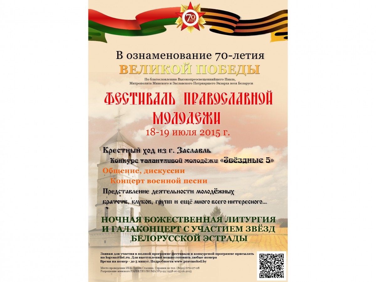 | | 7 ИЮЛЯ 2015 (Вторник) 10:58:16 18-19 июля по благословению митрополита Минского и Заславского Павла, Патриаршего Экзарха всея Беларуси, на территории историко-культурного комплекса "Линия Сталина" пройдёт фестиваль православной молодёжи Минской епархии, посвящённый 70-летию Великой Победы. В мероприятии примут участие молодёжные братства и, впервые, представители Белорусского республиканского союза молодёжи и светских учебных заведений.