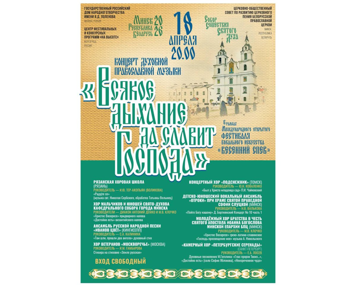 18 апреля в Свято-Духовом соборе Минска, в рамках международного открытого фестиваля вокального искусства "Весенний спев", состоится концерт духовной православной музыки "Всякое дыхание да славит Господа". Начало в 20.00.