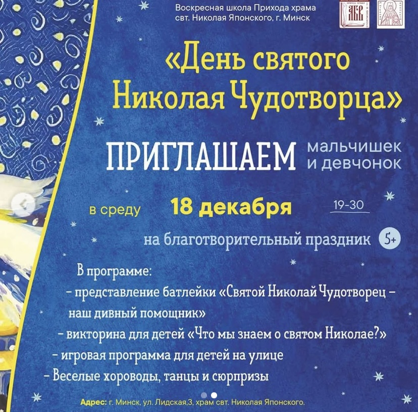 | | 13 ДЕКАБРЯ 2024 (Пятница) 14:12:13 18 декабря приход святителя Николая Японского города Минска приглашает мальчишек и девчонок от 5 лет на благотворительный праздник "День святого Николая Чудотворца".