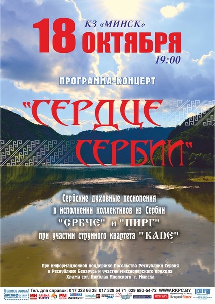 | | 18 СЕНТЯБРЯ 2015 (Пятница) 10:31:18 "Сердце Сербии" - именно такое название получил новый концерт в рамках фестиваля "Небесное созвучие", который пройдёт 18 октября в концертном зале "Минск". Это будет насыщенная программа, в которой примут участие трио "Србче" и знаменитый вокальный ансамбль "Пирг" (Сербия) в сопровождении струнного квартета "КАDE" из Минска. Прозвучат сербские народные песни и духовные канты, богослужебные песнопения и инструментальные композиции.