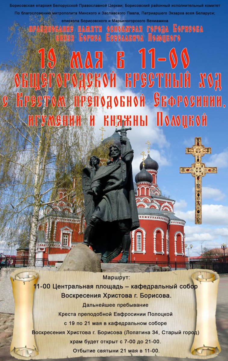 | | 14 МАЯ 2018 (Понедельник) 12:03:16 19 мая в Борисове состоится общегородской крестный ход с крестом преподобной Евфросинии, игумении и княжны Полоцкой.
