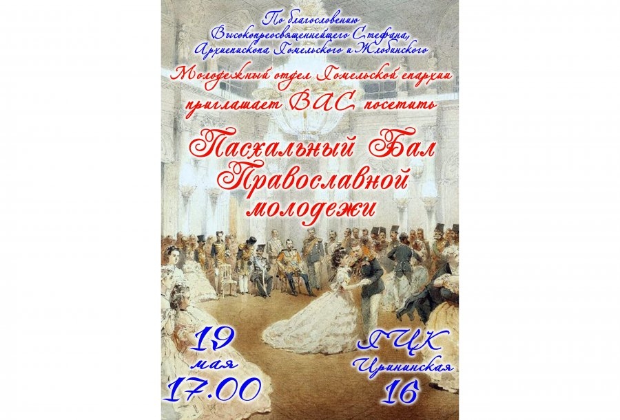 | | 14 МАЯ 2018 (Понедельник) 11:49:49 19 мая в 17:00 в Городском центре культуры города Гомеля состоится Пасхальный бал православной молодёжи.
