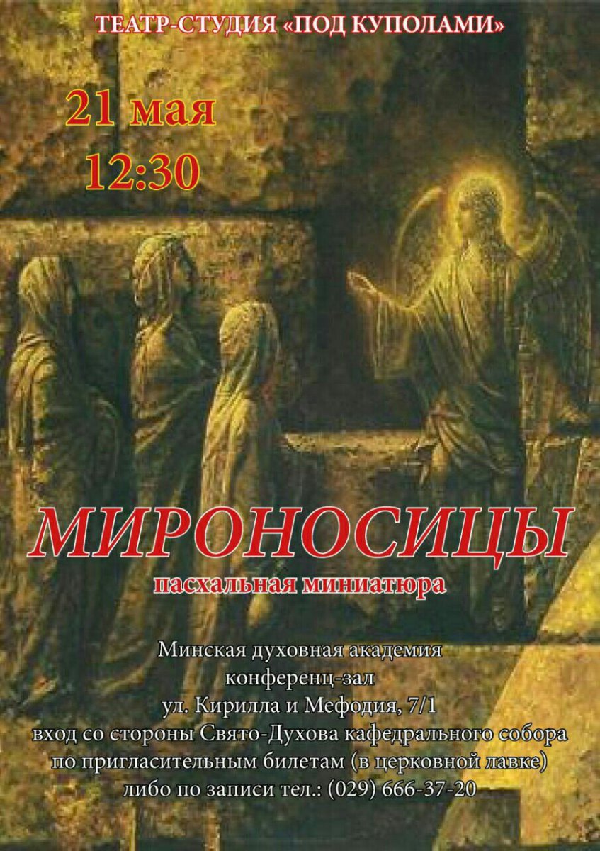| | 17 МАЯ 2017 (Среда) 15:13:15 21 мая в 12.30 в актовом зале Минской духовной академии будет представлена пасхальная миниатюра "Мироносицы", подготовленная театром-студией "Под куполами".