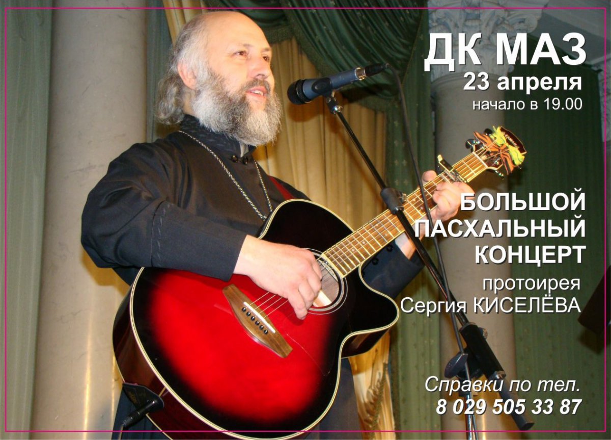 | 19 МАРТА 2018 (Понедельник) 12:27:31 В пасхальные дни, 23 апреля, во Дворце культуры Минского автомобильного завода пройдет концерт автора и исполнителя духовных песен протоиерея Сергия Киселева. Начало в 19.00.Билеты можно приобрести в церковных лавках во Дворце искусств (ул. Козлова, 3), в переходе метро "Каменная горка", а также в лавке возле Державного храма Свято-Елисаветинского монастыря. Сергий Киселев уверовал в Бога и крестился в сознательном возрасте, в 25 лет. Музыкой и поэтическим творчеством интересовался с ранних лет, после прихода к вере увлечение стало "Проповедью Евангелия в песнях" - так называют слушатели концерты отца Сергия. Слова и музыка не только трогают душу, но и строго спрашивают собственную совесть: как ты живешь, Человек - образ и подобие Божье? О чем он поет? О жизни: любви, доброте, сочувствии, сострадании, о греховности падшей человеческой природы, отчаянии, духовной брани, покаянному пути ко Господу и огромной радости сопричастия Творцу. Более 20 лет отец Сергий Киселёв служит священником в с. Сулимовка Киевской области. По благословению покойного Митрополита Киевского и Всея Украины Владимира ездит с концертами по Украине и другим странам. Его произведения – это синтез бардовской песни и проповеди. Pravminsk.by/ sobor.by/ (просмотров 2004) |
