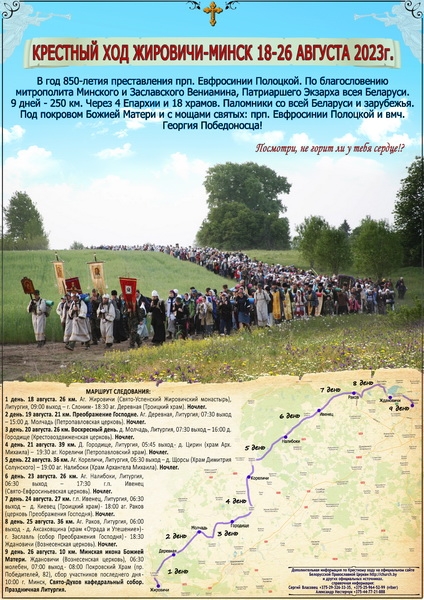 18 по 26 августа пройдет крестный ход из Свято-Успенского Жировичского монастыря в Минский Свято-Духов кафедральный собор для участия в торжествах, посвященных празднованию Минской иконы Божией Матери. Крестное шествие состоится в ознаменование 850-летия преставления прп. Евфросинии Полоцкой и по благословению Митрополита Минского и Заславского Вениамина, Патриаршего Экзарха всея Беларуси. Сообщает официальный портал Белорусской Православной Церкви.
