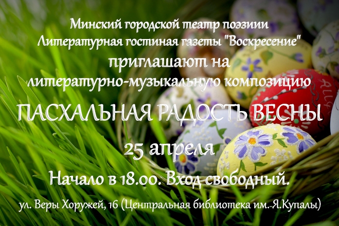 | 18 АПРЕЛЯ 2018 (Среда) 10:32:26 Главное управление идеологической работы, культуры и по делам молодежи Мингорисполкома, Минское городское отделение Союза писателей Беларуси, Центральная библиотека им. Янки Купалы и Литературная гостиная газеты “Воскресение” приглашают 25 апреля в Минский городской театр поэзии на литературно-музыкальную композицию "Пасхальная радость весны". Начало в 18.00. Вход свободный.Стихи и песни поэтов Аллы Чёрной, Елизаветы Полеес, Елены Михаленко, Татьяны Дашкевич и Николая Шипилова прозвучат в исполнении авторов, а также заслуженной артистки Республики Беларусь Ирины Нарбековой, артистов театра, кино и эстрады Евгения Пименова, Ольги Богушиньской, Елены Шабад, тележурналиста Ольги Михаленко, Ивана Пименова и Анастасии Ковкрак. В программе также примут участие композитор Алина Безенсон, Альбина Тонких, Анна Потапова, Елена Пименова (вокал), Елена Зеленкевич (фортепиано), Марина Пашкевич (флейта), Юлия Арутюнова (гитара). Минский городской театр поэзии создан на базе Центральной библиотеке им. Янки Купалы по адресу: ул. Веры Хоружей, 16. / sobor.by/ (просмотров 1668) |