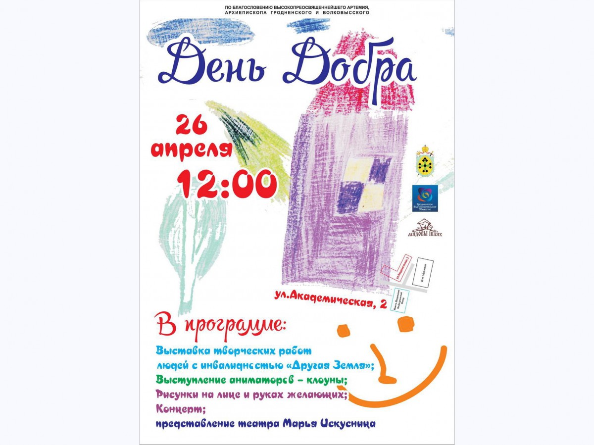 | | 10 АПРЕЛЯ 2015 (Пятница) 16:05:20 Тот, кто делает добро другому, доставляет больше всего радости себе. Гродненская епархия объявляет о проведении ежегодной благотворительной акции «День добра», которая состоится по благословению архиепископа Гродненского и Волковысского Артемия 26 апреля в 12.00 в актовом зале церковно-приходского комплекса при Свято-Покровском кафедральном соборе в Гродно.