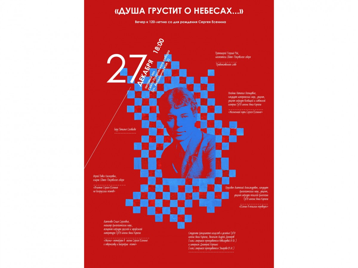 | | 22 ДЕКАБРЯ 2015 (Вторник) 13:28:55 Вечер, посвящённый жизни и творчеству Сергея Есенина "Душа грустит о небесах...", состоится 27 декабря в 18.00 в клубе православного общения на базе Свято-Покровского кафедрального собора Гродно.