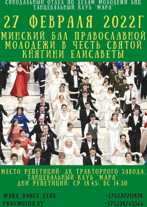 | | 26 ЯНВАРЯ 2022 (Среда) 14:49:35 27 февраля в Минском государственном дворце детей и молодежи (Старовиленский тракт, 41) состоится "Бал православной молодежи в честь святой княгини Елисаветы".