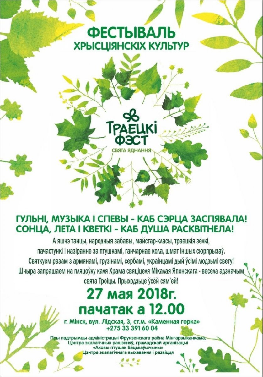 | 15 МАЯ 2018 (Вторник) 13:26:18 27 мая при минском храме святителя Николая Японского пройдёт ежегодный православный фестиваль христианских культур "Траецкi фэст". Начало в 12.00. Фестиваль пройдёт на территории прихода по адресу: ул. Лидская, 3 (ст.м. "Каменная горка").День Святой Троицы празднуется Церковью на пятидесятый день после Пасхи, поэтому его называют ещё Пятидесятницей. В этот день вспоминают сошествие Святого Духа на апостолов. Этот день считается днём рождения Новозаветной Церкви и торжественно празднуется с древнейших времён. "Траецкi фэст" проходит при поддержке Центра экологических решений и имеет не только просветительско-развлекательную, но и экологическую направленность. Гостей праздника ожидает разнообразная насыщенная программа: большой концерт любительских и профессиональных творческих коллективов для детей и взрослых. Для вас будут выступать: - Детский мцзыкально-хореографический проект "Шоколадная фабрика"; - Студя" Варгин"; - Ансамбль храма Воскресения Христова; - Праздничный хор Прихода храма свт.Николая Японского, регент Н. Булахов; - Детский хор Прихода Храма свт.Николая Японского, руководитель Т. Пышная; - Солистка ансамбля ГУВД Мингорисполкома Ирина Веркович; - Фолк-медиа группа "Беларускі гасцінец"; - Анна Ситник, выпускница БГАМ, дипломант конкурса "Убельская ластаўка" и всероссийского конкурса им.Барсовой в Сочи. Работала солисткой капеллы "Сонорус". Работала в Южной Корее и на европейском лайнере; - Ансамбль народной песни "Лилея", худ. рук. Т. Давыдюк; - Армянский танцевальный ансамбль "Эребуни"; - Давид Бадалян, армянский дудук; - Гоар Акопян (сопрано), выпускница Ереванской государственной консерватории, лауреат международных конкурсов; - Студия "Музыкальный кубик", худ. рук. Анна Дюкарева; - Поэт, композитор и певица Ольга Патрий; Также в программе: - Экскурсия по экотропе от Центра экологического воспитания и развития; - Интерактивный мастер-класс по сортировке мусора; - Мастер-класс "Домашний огородик" от Центра экологических решений (ЦЭР); - Экологический кинотеатр для детей и взрослых от ЦЭР; - Выставка от Центра Экологических Решений; - Экологическая инфоточка; - Наблюдение за птицами и мастер-классы от Минского отделения "Аховы птушак Бацькаушчыны"; - Мастер-класс от "Амигуруми-клуба"; - Мастер-класс по плетению веночков; - Мастер-класс по заплетанию кос; - Гончарный круг; - Аквагрим; - Перетягивание каната; - Акция "Зелёные университеты"; - Акция "Новая жизнь в обмен на крышечку". Собравшему самое большое количество крышечек — подарок: эко-игрушка от "Амигуруми-клуба". Для проголодавшихся будет работать полевая кухня, где вы сможете подкрепиться вкусным сырным супом, ароматной ухой, сочным шашлыком, солдатской гречневой кашей с тушёнкой, домашней выпечкой, настоящим узбекским пловом и попить чая. n-do.by / sobor.by/ (просмотров 1840) |