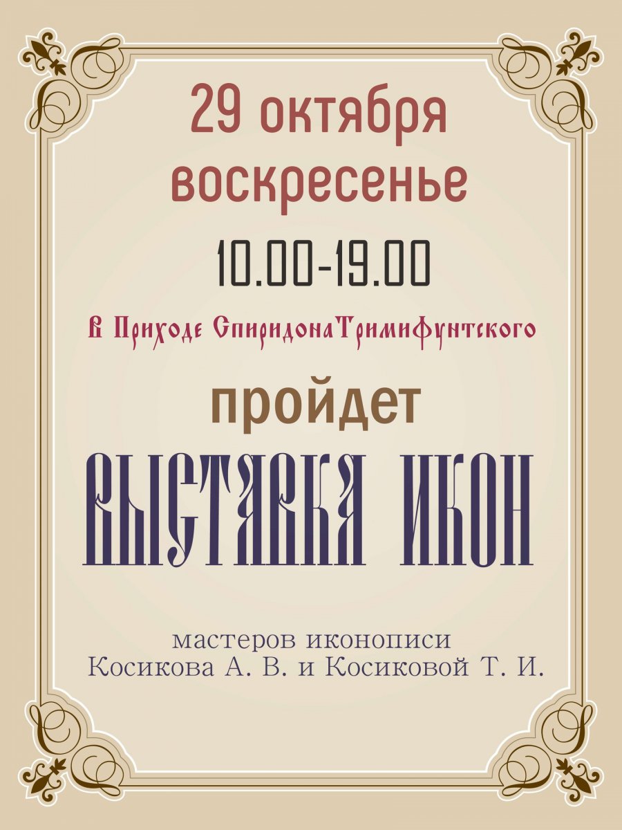 | | 23 ОКТЯБРЯ 2017 (Понедельник) 10:09:15 29 октября в минском приходе святителя Спиридона Тримифунтского с 10.00 до 19.00 пройдёт выставка икон супругов Андрея и Татьяны Косиковых.