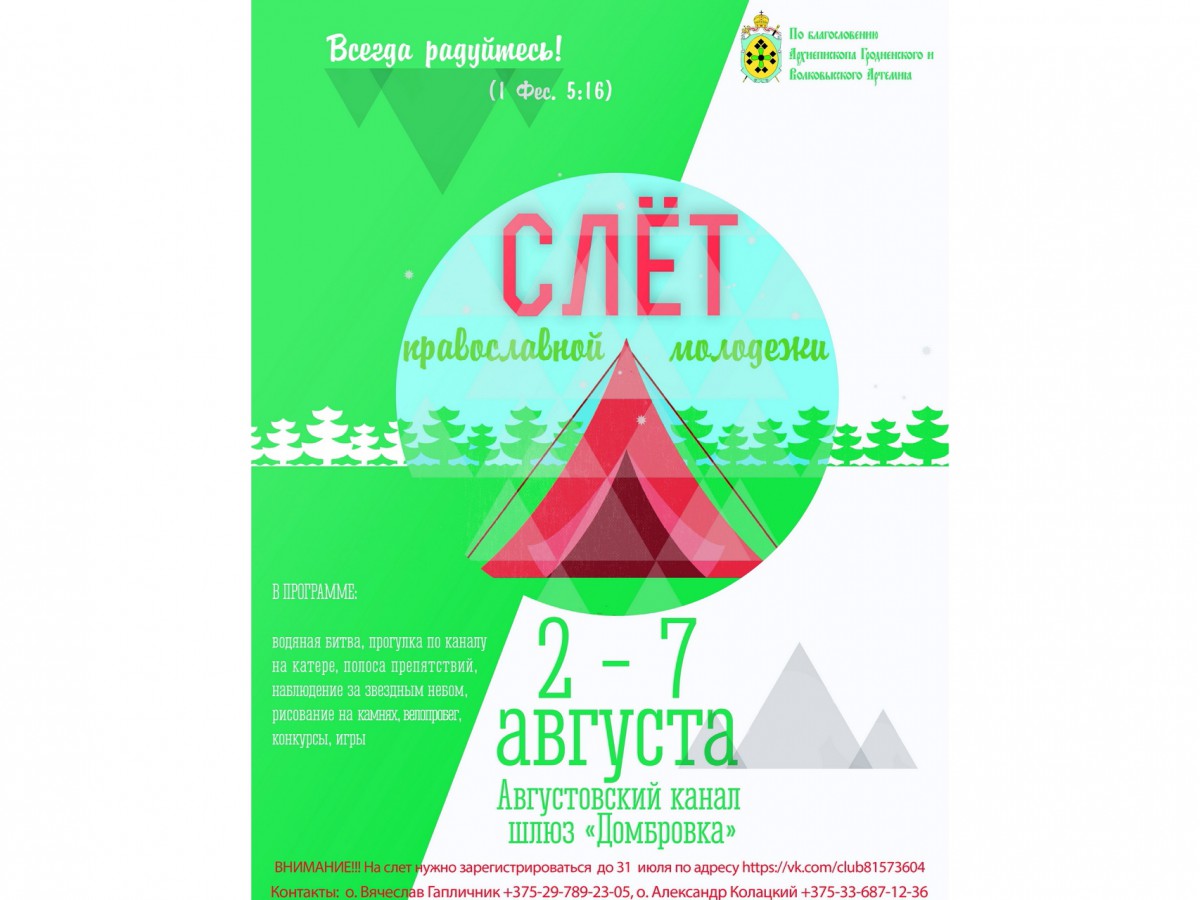 С 2 по 7 августа на Августовском канале возле шлюза "Домбровка" пройдёт епархиальный слёт православной молодёжи Гродненской епархии. Принять участие в слёте может молодёжь старше 16 лет. В рамках слёта состоится Божественная литургия, будут проводиться духовные беседы со священнослужителями. Также участников форума ждёт интересная программа: игры, конкурсы, велопробег, водяная битва, полоса препятствий, прогулка по каналу на катере, мастер-класс по рисованию на камнях, наблюдение за звёздным небом и многое-многое другое. ✔ Участникам слёта необходимо с собой иметь: - палатку, спальный мешок, коврик; - одежду спортивную и для храма; - кружку, миску, ложку; - плащ-дождевик; - фонарик; - фликер; - средство от комаров; - средства личной гигиены. ✔Денежный взнос: 12 бел. руб. (120 000 до деноминации). ✔ Для участия в слёте необходимо заполнить регистрационную анкету . За дополнительной информацией обращаться в оргкомитет слёта: +375-29-789-23-05 мтс - прот. Вячеслав Гапличник, +375-33-687-12-36 мтс - диакон Александр Колацкий, +375-29-58-14-708 мтс - Рудинский Александр. / sobor.by / orthos.org (просмотров 2949) Новости разделов: