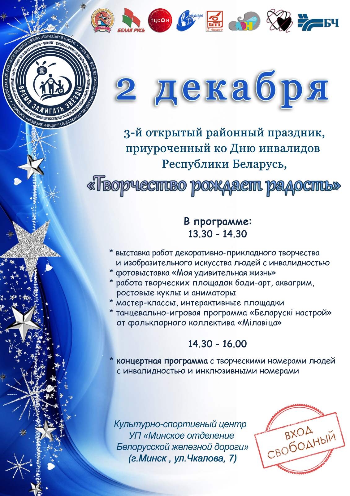 2 декабря в 13-30 Культурно-спортивный центр УП «Минское отделениеБелорусской железной дороги» (ул. Чкалова, 7) распахнет свои двери дляучастников и гостей праздника «Творчество рождает радость»