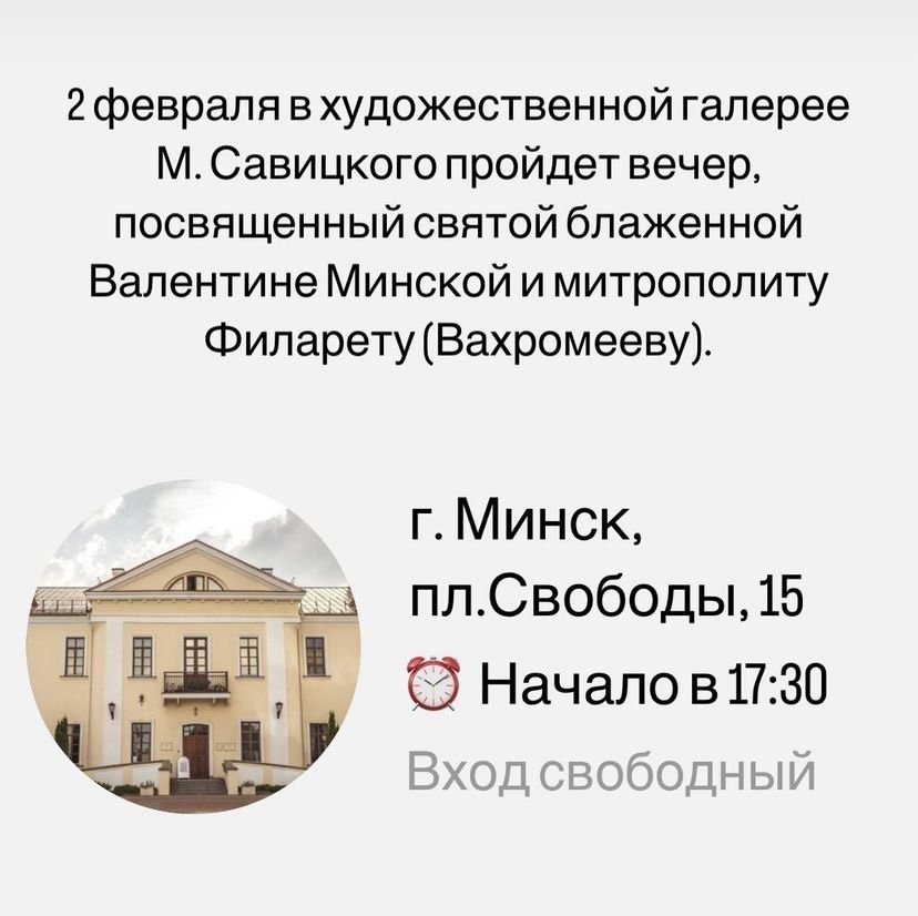 | | 1 ФЕВРАЛЯ 2023 (Среда) 16:54:47 2 февраля в художественной галерее Михаила Савицкого в столице пройдет вечер, посвященный блаженной Валентине Минской и Митрополиту Филарету (Вахромееву). Начало в 17.30.