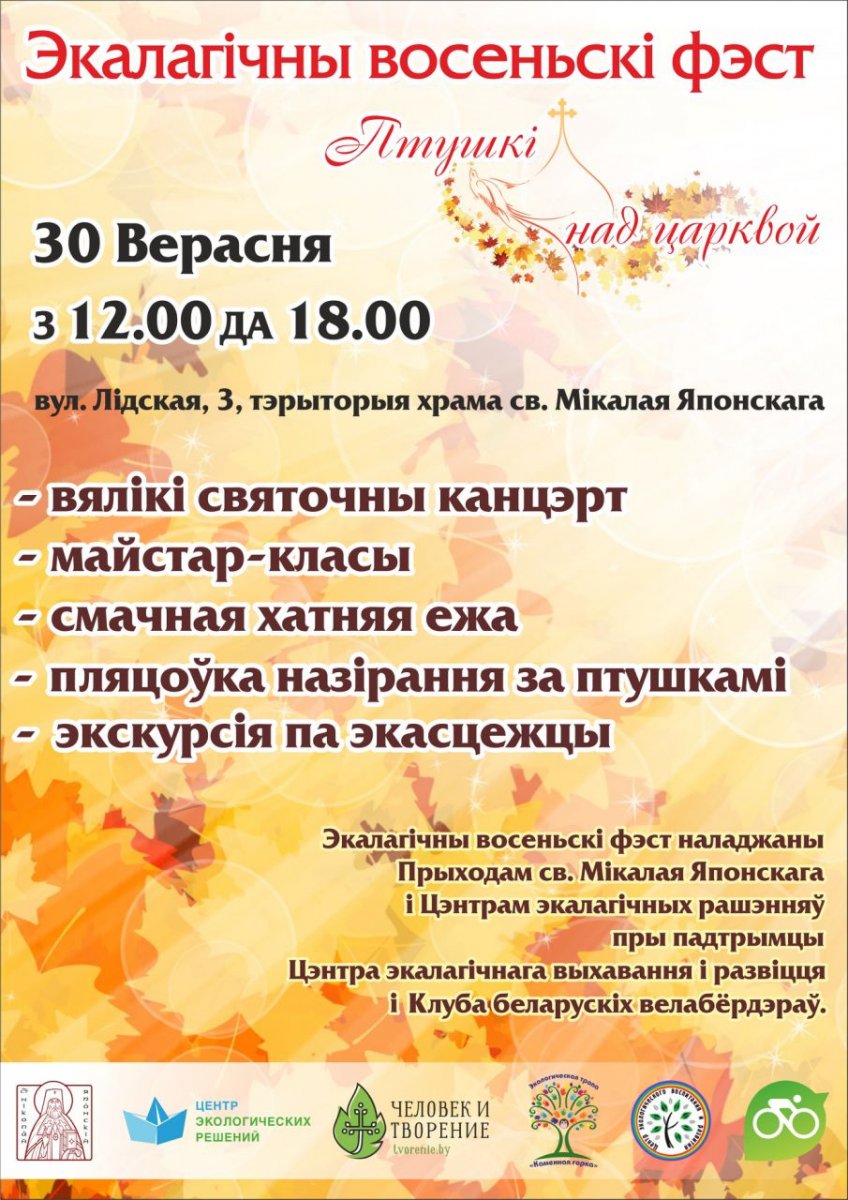 В воскресенье, 30 сентября, на площадке православного прихода в честь святителя Николая Японского (ул. Лидская, 3) развернётся ежегодный экологический фестиваль "Птушкі над царквой". Фестиваль пройдёт с 12.00 до 18.00. Вход свободный.