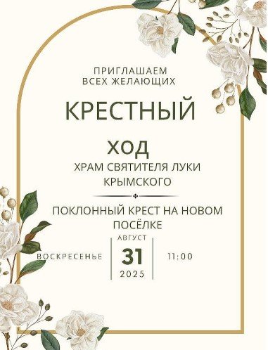 | | 29 АВГУСТА 2025 (Пятница) 15:08:16 31 августа в Столине пройдет крестный ход от храма святителя Луки, исповедника Симферопольского и Крымского, до поклонного Креста на Новом Поселке.