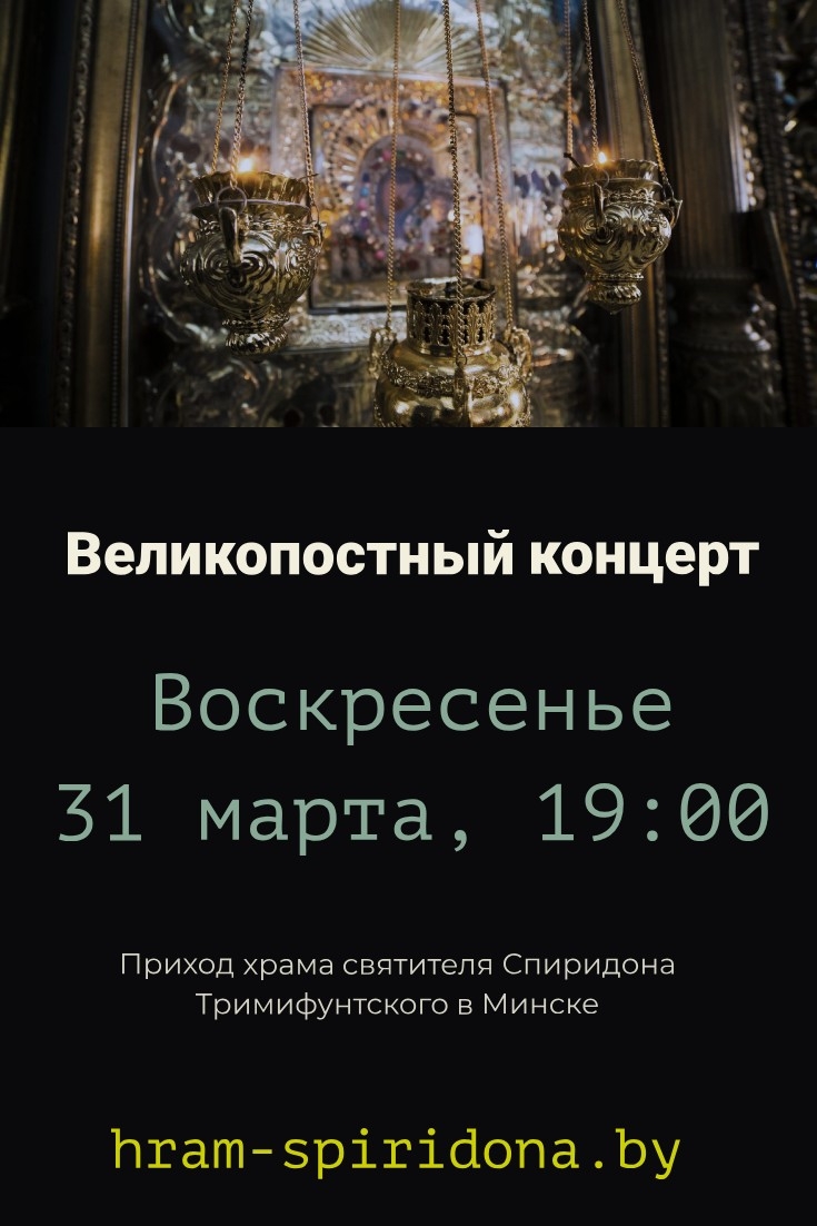 | | 25 МАРТА 2019 (Понедельник) 10:43:47 31 марта в 19:00 минский приход святителя Спиридона Тримифунтского приглашает всех желающих приобщиться к богатой певческой традиции Православной Церкви, побывав на Великопостном концерте.