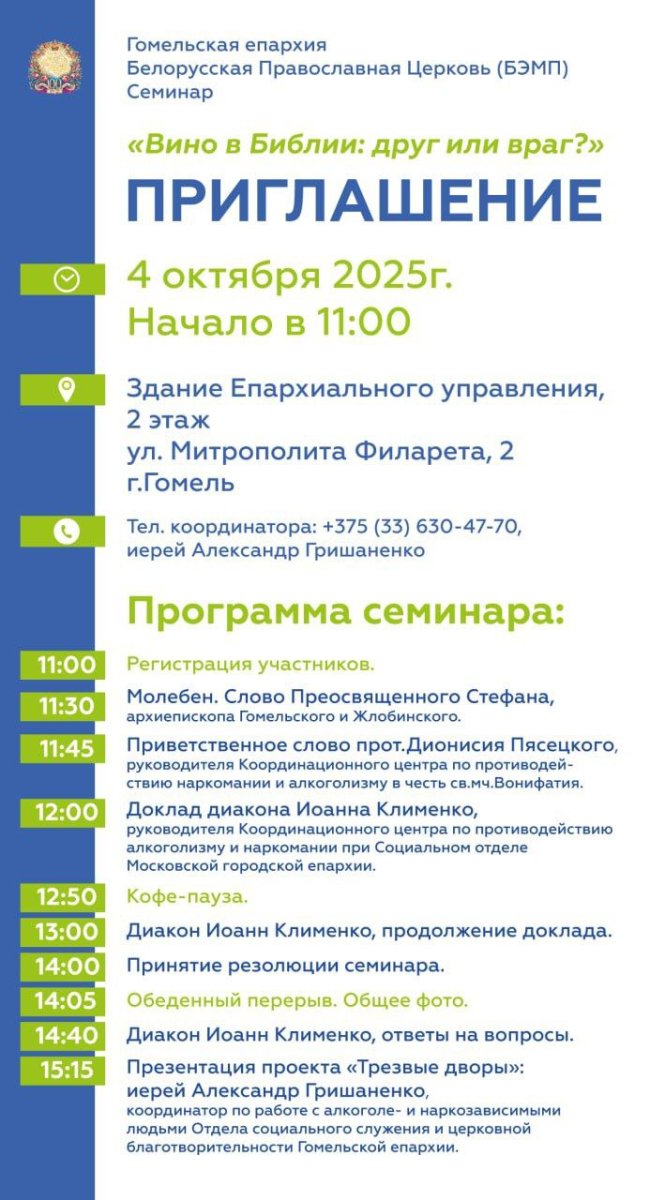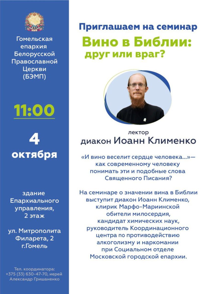 | 30 СЕНТЯБРЯ 2025 (Вторник) 11:13:22 4 октября в здании Гомельского Епархиального управления состоится семинар на тему «Вино в Библии: друг или враг». Начало в 11.00.«И вино веселит сердце человека…» - как современному человеку понимать эти и другие слова Священного Писания, посвящённые вину? Об этом расскажет диакон Иоанн Клименко, клирик Марфо-Мариинской обители милосердия, кандидат химических наук, руководитель Координационного центра по противодействию алкоголизму и наркомании при Социальном отделе Московской городской епархии. Программа 11.00 - Регистрация участников 11.30 - Молебен и слово архиепископа Гомельского и Жлобинского Стефана 11.45 - Приветственное слово протоиерея Дионисия Пясецкого, руководителя Координационного центра по противодействию наркомании и алкоголизму в честь святого мученика Вонифатия 12.00 - Доклад диакона Иоанна Клименко 12.50 - Кофе-пауза 13.00 - Продолжение доклада диакона Иоанна Клименко 14.00 - Принятие резолюции семинара 14.05 - Обеденный перерыв, общее фото 14.40 - Ответы на вопросы, выступление диакона Иоанна Клименко 15.15 - Презентация проекта «Трезвые дворы»; доклад иерея Александра Гришаненко, координатора по работе с алкоголе- и наркозависимыми Отдела социального служения и церковной благотворительности Гомельской епархии. Приглашаются все заинтересованные принять участие в обсуждении важной темы, связанной с духовным и социальным здоровьем общества. Адрес: Гомель, ул. Митрополита Филарета, 2, 2 этаж. / sobor.by/ eparhiya.by (просмотров 1019) |