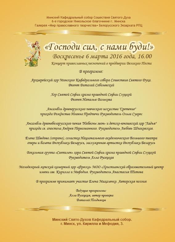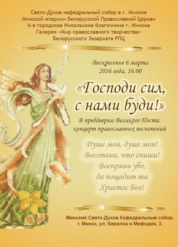| | 29 ФЕВРАЛЯ 2016 (Понедельник) 14:42:38 Концерт "ГОСПОДИ СИЛ, С НАМИ БУДИ! В ПРЕДДВЕРИИ ВЕЛИКОГО ПОСТА" начнется в 16.00.