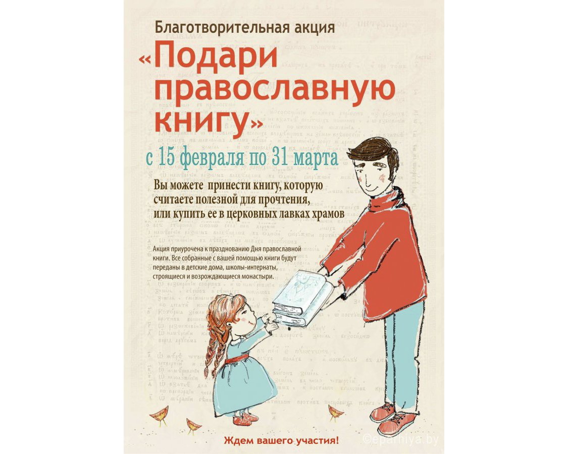 Суть акции состоит в том, что вы можете принести или купить в церковной лавке храмов книгу, которая, по вашему мнению, будет интересна для прочтения другим людям. Книги, собранные во время благотворительной акции, в том числе и с вашей помощью, будут переданы в детские дома, школы-интернаты. Даже начав с такой малости, мы поможем возрождению духовности и проповеди Православия через книгу. Так давайте сделаем это!