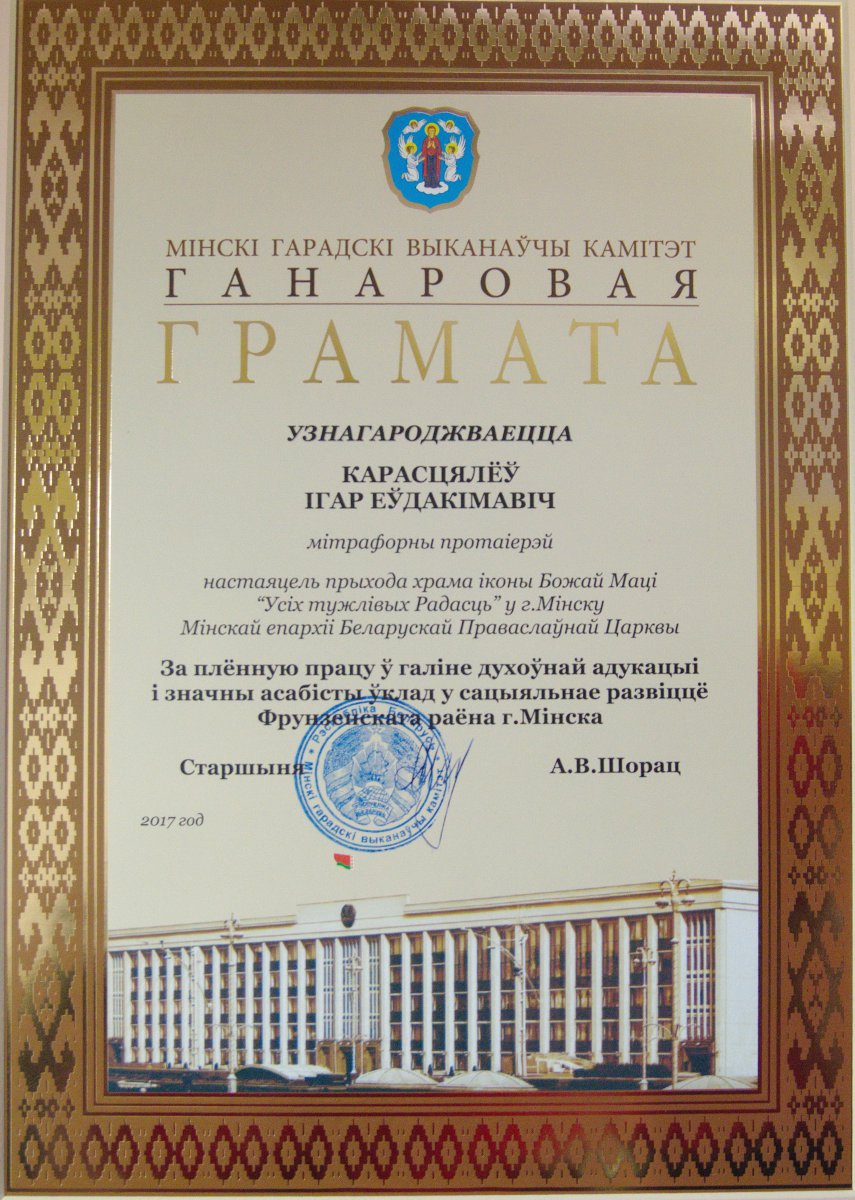 Старшыня Мінгарвыканкама Андрэй Віктаравіч Шорац узнагародзіў ганаровай граматай мітрафорнага протаіерэя Ігара Карасцялёва, настаяцеля прыхода іконы Божай Маці “Усіх тужлівых Радасць” за плённую працу ў галіне духоўнай адукацыі і значны асабісты ўклад у сацыяльнае развіцце Фрунзенскага раёна Мінска.
