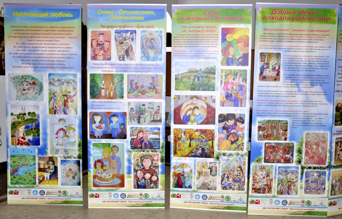 Выставка «Мы рисуем мир семьи» – совместный проект Белорусской Православной Церкви и Минского городского института развития образования - представляет собой экспозицию из 9 стендов: «Семья – уютный, теплый дом», «Добрые дети - похвала родителей», «Смысл жизни», «Свет материнской любви», «Чудо жизни», «Чти отца своего и матерь», «Отец. Отцовство. Отечество», «Настоящая любовь», «Законы семейного взаимопонимания». Стенды включают работы детей из многих стран мира и картины профессиональных художников на тему традиционной семьи. / sobor.by/ (просмотров 4173)