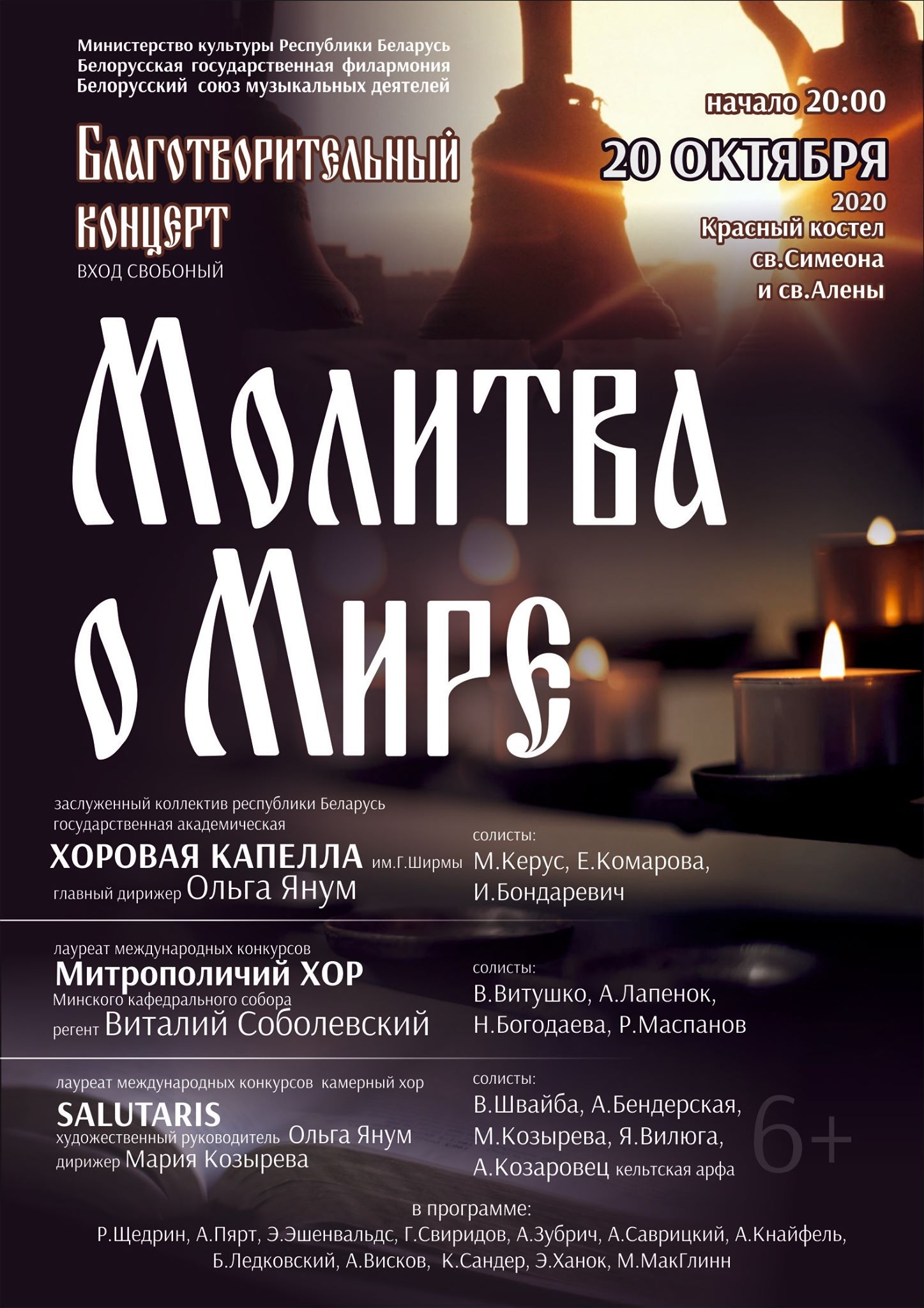 | | 7 ОКТЯБРЯ 2020 (Среда) 13:25:12 20 октября в 20:00 в Минске состоится благотворительный концерт "Молитва о мире". Мероприятие пройдет в Красном костеле имени св.Симеона и св.Алены.