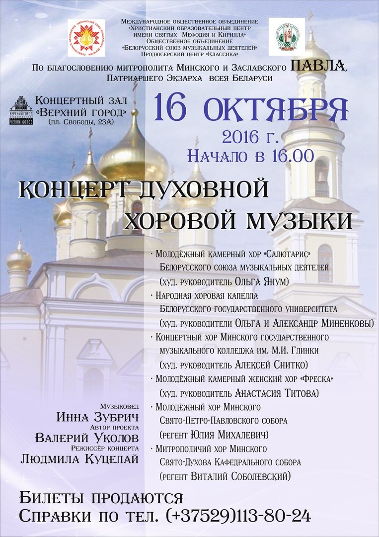 | 30 СЕНТЯБРЯ 2016 (Пятница) 15:50:57 16 октября в концертном зале "Верхний город" пройдёт благотворительный концерт духовной хоровой музыки, в котором примут участие шесть коллективов. Как рассказали организаторы концерта, это мероприятие станет первым совместным проектом Белорусского союза музыкальных деятелей и Международного общественного объединения "Христианский образовательный центр им. Мефодия и Кирилла". Во время концерта перед зрителями выступят шесть коллективов, среди которых – лучшие церковные хоры Минска, такие как молодёжный камерный хор "Салютарис", митрополичий хор минского Свято-Духова кафедрального собора и молодёжный хор минского Свято-Петро-Павловского собора, а также светские хоры. На концерте прозвучат произведения православной духовной музыки и обработки белорусских народных песен. Ведущая концерта – известный музыковед Инна Зубрич. Мероприятие носит благотворительный характер – средства, вырученные от продажи билетов, пойдут на восстановление концертного рояля, который находился около 15 лет в заброшенном помещении, реставрируемом Христианским образовательным центром. Телефон для справок: (+37529)113-80-24./ sobor.by/ Надежда Филипчик (просмотров 3650) |