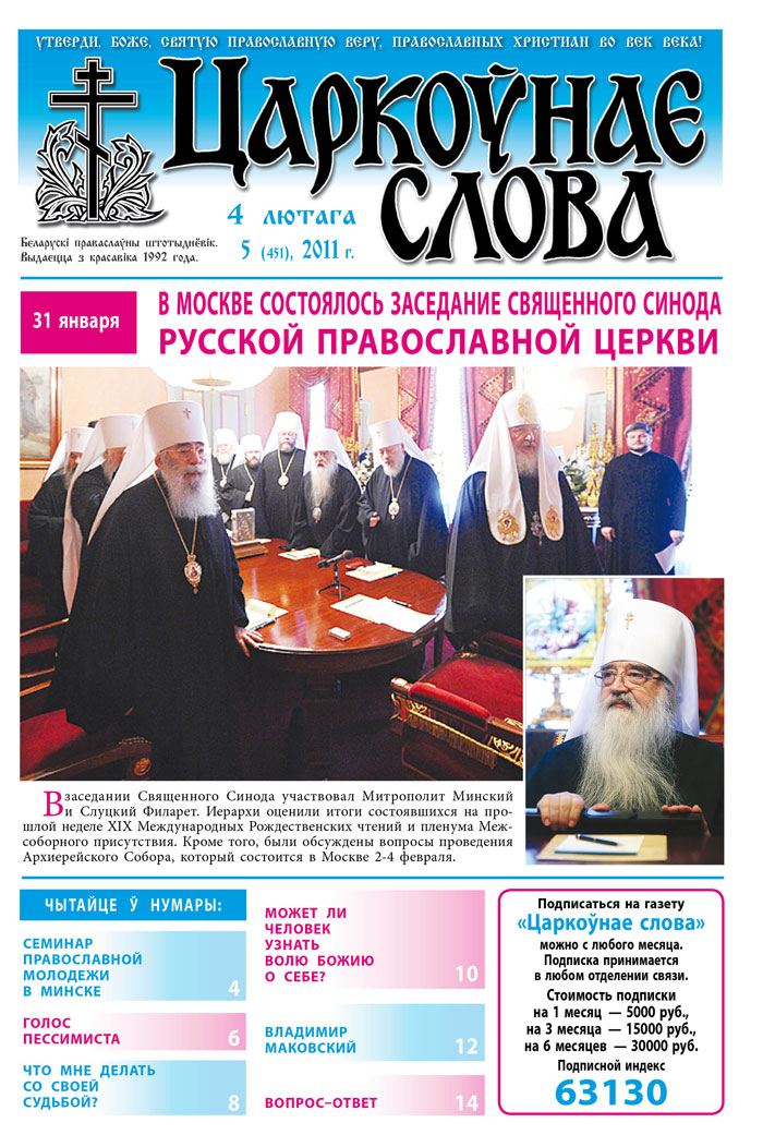 В номере газеты «Царкоўнае слова», что вышел 3 февраля, сообщение о заседании Священного Синода и решения пленума Межсоборного присутствия РПЦ, прошедших в Москве в период с 28 по 31 января. Материл «Семинар православной молодежи в Минске» сообщает, что его участники, которые собрались 29 января в Доме паломника Свято-Елисаветинского монастыря, «рассказали о деятельности своих организаций, о видах молодежного служения в них, делились проблемами, с которыми они сталкиваются, а также обсудили пути их решения. Кроме того, обсуждались перспективы взаимодействия молодежных организаций с миссионерским отделом Минской епархии». Окончание статьи «Голос пессимиста» повествует о «людях, в силу своих психологических особенностей цепко хватающихся за внеш¬нюю, обрядовую сторону любого церковного явления. Речь идет об обсессивно-компульсивном (obsession — «одержимость идеей», compulsion — «принуждение» — ред.) типе характера, или личностях с навязчивостями». «Что мне делать со своей судьбой?» Известные российские священники отвечают на вопросы о судьбе: Может быть, воля Божья — это и есть то, что люди называют судьбой? Как человеку научиться слышать волю Божию? В какой момент Господь начинает направлять человека? Если человек стремится к чему-нибудь, например, в карьере, но никак не может этого достигнуть, — это значит, что не следует ему этим заниматься или это у него такой трудный путь? Как соотнести судьбу и смирение с волей Божией? Есть такое понятие — «суженый», «вторая половинка» — то есть, каждому заранее предназначен конкретный человек? Что делать, если обстоятельства сильнее человека? Продолжает тему интервью под названием «Может ли человек узнать волю Божию о себе?» В беседе со спецкорреспондентом портала «Православие и мир» протоиерей Алексий Уминский размышляет о том, как искать волю Божию, как связаны воля Божия и послушание духовнику, и о том, как преодолевать трудные жизненные ситуации и искать Бога в самые скорбные жизненные моменты. Также в номере заметка к 165-летию со дня рождения художника Владимира Маковского. «В своем творчестве художник неоднократно обращался к библейским сюжетам. В 1870-е годы он участвовал в росписи храма Христа Спасителя в Москве, в 1894 году работал над убранством храма Христа Спасителя в Борках, под Харьковом, на месте крушения поезда российского императора Александра III». В номере традиционные рубрики «Хронограф», «Вопрос-ответ», «Алфавит духовный», а также сообщение о том, что в синодальном Отделе по взаимоотношениям Церкви и общества разработали Свод российских ценностей и призывают к широкому обсуждению этого документа. Газета «Церковное слово» - единственная еженедельная православная газета в Беларуси. Издается с 1992 года. Учредитель — Минская епархия. Подписной индекс газеты 63130. /sobor.by/ (просмотров 6127)