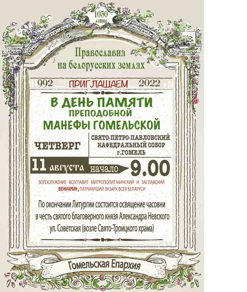 | | 10 АВГУСТА 2022 (Среда) 09:34:37 В рамках празднования 1030-летия Православия на белорусских землях 11 августа в Петро-Павловском кафедральном соборе Гомеля состоятся торжества, посвященные дню памяти преподобной Манефы Гомельской. Сообщает Гомельская епархия.