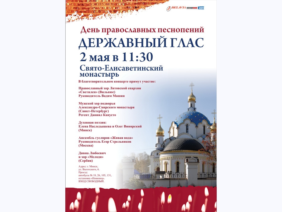 | 3 АПРЕЛЯ 2015 (Пятница) 13:12:18 Тринадцатый по счёту Международный фестиваль «Державный глас» впервые в этом году пройдёт в номом формате, объединив в одно целое четыре концертных программы на разных площадках. 30 апреля в конгресс-холле гостиницы «Президент-Отель» состоится концерт-презентация «Единым сердцем» с участием Праздничного хора Свято-Елисаветинского монастыря и регента монахини Иулиании (Денисовой). В программе вечера - премьера документального фильма о певчих хора и творческая встреча с режиссёром Юлией Воскобойниковой, регентом и певчими. Начало в 18.30. Справка по билетам: +375 29 505 33 87. Место проведения: Минск, ул. Кирова, 18. 1 мая в 19.00 на сцене КЗ «Минск» состоится совместный концерт сербской исполнительницы Дивны Любоевич и хора «Мелоди», и мужского хора «Всехсвятский» под управлением регента Дмитрия Токмакова. В концерте прозвучат богослужебные песнопения византийского и русского распевов, а также народные песни. Концерт пройдёт по благословению митрополита Минского и Заславского Павла, Патриаршего Экзарха всея Беларуси, в рамках Международного фестиваля «Небесное созвучие», организованного при поддержке Свято-Елисаветинского монастыря и миссионерского отдела храма в честь святителя Николая Японского. Начало в 19.00. Справка по билетам: +375 29 505 33 87. Место проведения: Минск, ул. Октябрьская, 5. Основной концерт фестиваля «Державный глас» с участием хоровых коллективов из Сербии, Литвы и России пройдёт 2 мая в 11.30 в храме в честь иконы Божией Матери «Державная» Свято-Елисаветинского монастыря. Фестиваль «Державный глас» не является конкурсом, и благодаря этому на импровизированной сцене в храме одинаково удобно будут чувствовать себя и сербская звезда Дивна Любоевич с хором «Мелоди», и молодой литовский хор «Светилен» (регент Вадим Машин). Разнообразие в музыкальную программу внесут наши соотечественники, исполнители духовных стихов Елена Наследышева и Олег Винярский. Продолжат фестивальный день два российских коллектива: мужской хор Санкт-Петербургского подворья Александро-Свирского монастыря (руководитель Даниил Капусто), а также гусляр Егор Стрельников со своим ансамблем (Москва). Начало в 11.30. Вход свободный. Место проведения: Минск, ул. Выготского, 6. 3 мая в зале собраний воскресной школы при Свято-Елисаветинском монастыре состоится концерт самобытного гусляра-инструменталиста, виртуоза-самородка Егора Стрельникова и ансамбля «Живая вода». Начало в 15.00. Вход свободный. Место проведения: Минск, ул. Выготского, 6. / sobor.by/По материалам obitel-minsk.by (просмотров 3936) |