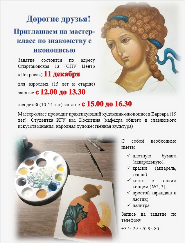 | | 10 ДЕКАБРЯ 2020 (Четверг) 11:21:01 Мастер-класс по знакомству с иконописью для детей и взрослых состоится 11 декабря в центре "Покрова" в Бобруйске.