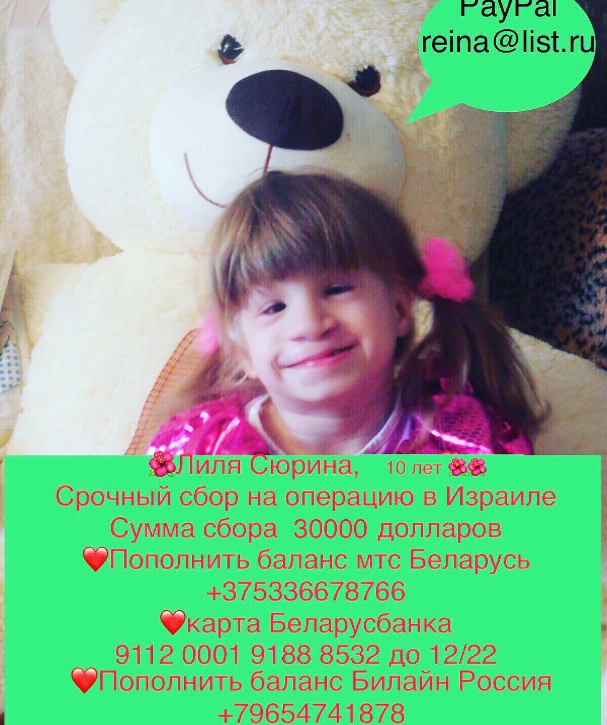 | 19 ОКТЯБРЯ 2020 (Понедельник) 15:11:54 "Вновь обращаюсь к вам в отчаянии и с просьбой о помощи моей дочери": написала в письме, которое пришло в редакцию Sobor.by, мама девочки Лилии (в крещении Лии)."Сюриной Лилии Андреевне, 18.06.2010 г.р., ребёнку-инвалиду самой тяжёлой степени утраты здоровья, очень нужна помощь. Надеюсь и верю, что найдутся люди, которые помогут нам закрыть сбор на операции и лечение и Лиля будет жить без боли и страданий. Читатели портала уже неоднократно помогали пройти очередной этап лечения тяжёлых заболеваний Лили. Пожалуйста, не пройдите мимо и в этот раз! Буду очень благодарна за любую помощь Лилечке! У Лилии многочисленные тяжёлые пороки развития. К сожалению, лечение и операции в Беларуси закончились для моей дочери тяжёлыми последствиями. После операций разошлись швы, искажено личико дочери, она не может нормально разговаривать, есть, дышать. Наша страна небольшая. Нет опыта лечения таких пациентов с редкими диагнозами. Больно смотреть, как моя дочь и её внешность с отпечатком тяжёлых заболеваний, является постоянным объектом насмешек, неприятных взглядов. Лиля совсем маленькая и очень худенькая, у неё дефицит роста и веса. Своим сверстникам она достаёт только до плеча. Дети сторонятся её, обижают и пока у неё только один друг - мама. В связи с этими обстоятельствами мы вынуждены были обращаться за помощью в известные клиники мира, где есть опыт лечения подобных заболеваний. Нам посчастливилось попасть в государственные клиники Израиля -Ихилов и Sheba, где моя дочь проходит постоянное лечение и ей сделаны две из требуемых пяти операций по устранению последствий неудачных операций. Мы лечимся без посредников, обращаясь напрямую в клиники. И таким образом минимизируем все расходы по лечению. Наша предыдущая поездка в Израиль на лечение состоялась в 2019 году. В этом году мы планировали собрать средства и полететь в клиники в марте. Но эпидемия коронавируса жестоко и беспощадно нарушила наши планы. Только совсем недавно мы получили информацию из клиник Израиля о том, что мы можем прилетать для оказания медицинской помощи. По ходатайству клиники через Министерство здравоохранения Израиля нам можно делать операцию и проходить очередной курс лечения. На данном этапе дочери требуется срочное хирургическое вмешательство, сложная операция. Операция требует высокого профессионализма, наличия специального оборудования, опыта хирурга и лекарственных препаратов, не зарегистрированных в РБ. Сумма по счёту составляет 14 526 долларов. Кроме этого, помимо операций, требуется сложное лечение сопутствующих заболеваний. Перед операцией будет проведён очередной этап лечения. В связи с тяжёлым состоянием ребёнка, это необходимость. Если срочно не продолжать лечение,мы можем получить тяжёлую степень онкологического заболевания. А последствия неудачных операций не оставят Лиле шанса хорошо говорить, видеть, нормально питаться. Я одна воспитываю свою дочь. Все ресурсы, силы и возможности брошены на спасение Лилечки. Мы уже смогли добиться очень хороших результатов. Лиля может самостоятельно ходить, пытается разговаривать, учится писать и рисовать. Фонды, которым можно доверять и которые я могу назвать порядочными, уже оказывали нам помощь на предыдущих этапах лечения и сейчас исчерпали свои ресурсы для помощи нам. У Лилии просто о