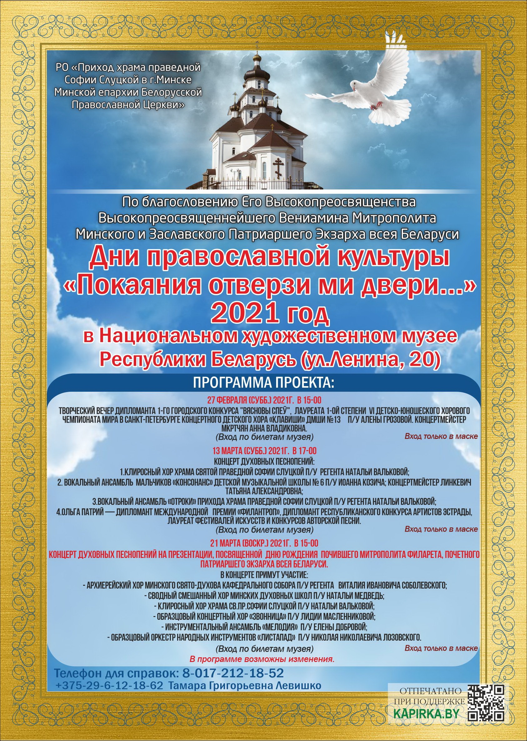 | | 24 ФЕВРАЛЯ 2021 (Среда) 11:21:08 Дни православной культуры "Покаяния отверзи ми двери...", организованные минским приходом праведной Софии Слуцкой, пройдут в Минске с 28 февраля по 21 марта.