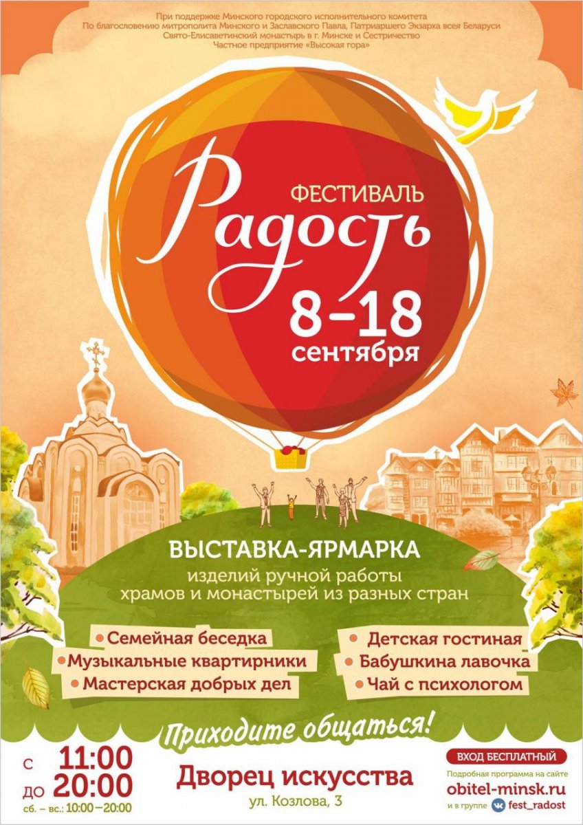 | 30 АВГУСТА 2018 (Четверг) 15:22:28 С 8 по 18 сентября международный фестиваль "Радость" приглашает всех в Минский Дворец искусства. Выставка-ярмарка "Радость" ― это не только захватывающий и увлекательный праздник для всей семьи, но и возможность порадовать друг друга душевными изделиями ручной работы, собранными на одной площадке из разных уголков мира: Беларуси, России, Молдовы, Сербии, Греции. Керамика, текстиль, литература, сувениры, иконы и церковная утварь ― далеко не весь перечень ассортимента. Чем будут удивлять на фестивале "Радость" В рамках проекта "Семейная беседка" пройдут интересные беседы на актуальные темы. Например, на встрече под говорящим названием "Как всё успеть" своим опытом и советами поделятся многодетные и приёмные родители, а также мамы, успешно развивающие карьеру. Чай с психологом ― площадка для индивидуальных консультаций с психологом (по предварительной записи). Путеводитель по православию ― своеобразный гид, где можно узнать о таинствах Исповеди, Причастия, Крещения, Венчания, а также задать самые животрепещущие вопросы, в том числе на тему воспитания детей в православных традициях. И, конечно, будет работать самая популярная площадка ― детская гостиная "Летучий корабль" с мастеровой каютой, театральной палубой и игровым отсеком. Каждый день будет наполнен новыми открытиями и искромётными путешествиями: анимационными программами, творческими мастерскими, художественными занятиями, сказочными перевоплощениями и театральными постановками. Состоятся увлекательные мастер-классы по флористике, декупажу, вытинанке. Кроме того, гости форума смогут создать свой теневой театр, написать этюд по мотивам Айвазовского или картину в авторской технике акварельной нити. На фестивале "Радость" будет не только интересно, атмосферно, интерактивно, но ещё и вкусно! На втором этаже Дворца искусства откроется кафе с домашней кухней и монастырской выпечкой. Здесь же состоятся "музыкальные квартирники", где в непринуждённой обстановке в формате диалога пройдут встречи с музыкантами. По доброй традиции гости фестиваля "Радость" смогут поучаствовать в благотворительных акциях. Также состоится конкурс совместных творческих работ "Бабушка и внуки". Это могут быть ваши рисунки, стихи, поделки. Награждение победителей состоится по результатам народного голосования. Вход для посетителей свободный. Место проведения: по ул. Козлова, 3/ sobor.by/ obitel-minsk.ru (просмотров 2884) |