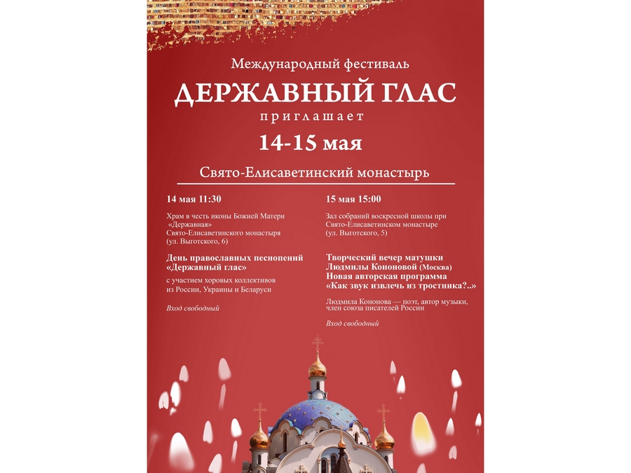 14 мая в 11.30 в Державном храме Свято-Елисаветинского монастыря (ул. Выготского, 6) выступят как юные исполнители - участники вокального ансамбля "Фонарики" (г. Москва, руководитель Юлия Кривякина), так и признанные вокалисты, пронёсшие через всю свою жизнь любовь к музыке и объединившиеся в хоре "Славянский сувенир" (г. Минск, руководитель Ольга Кузьмина).