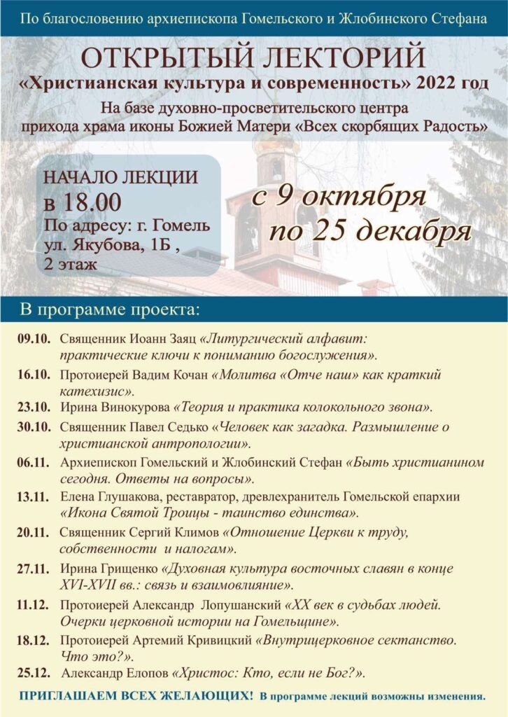 | | 28 НОЯБРЯ 2022 (Понедельник) 14:06:46 В октябре-декабре на базе духовно-просветительского центра прихода храма иконы Божией Матери "Всех скорбящих Радость" города Гомеля пройдут лекции "Христианство и современная культура". Сообщает пресс-служба Гомельской епархии.