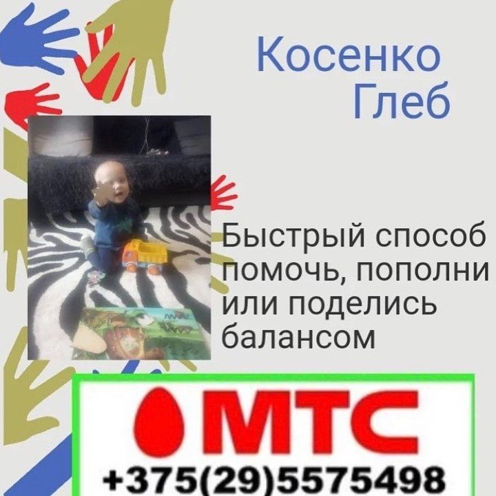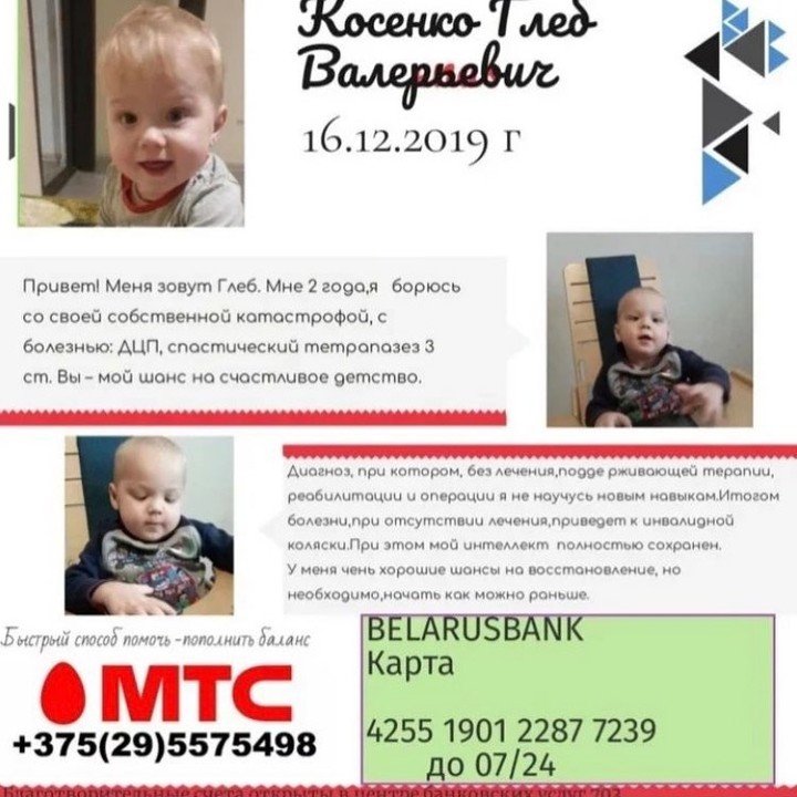 Мы из Бобруйска. Я многодетная мама 3 мальчишек.Безумная материнская любовь и отчаянье заставляю меня обращаться за помощью, стучаться во все двери. Речь идет о нашем младшем двухлетнем сыне Глебе, который борется со своей собственной катастрофой, с болезнью: ДЦП, спастический тетрапазез.
