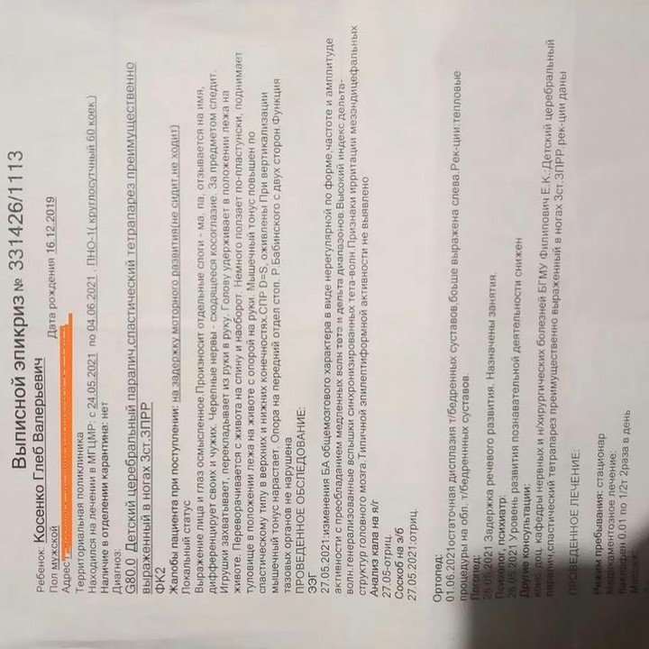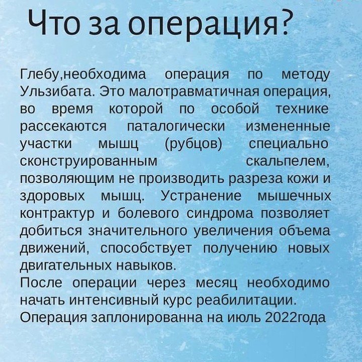 На сегодняшний день Глеб не сидит самостоятельно, не ходит. У Глеба очень хорошие шансы на восстановление, но для этого необходимо операционное лечение, нужно начать как можно раньше.