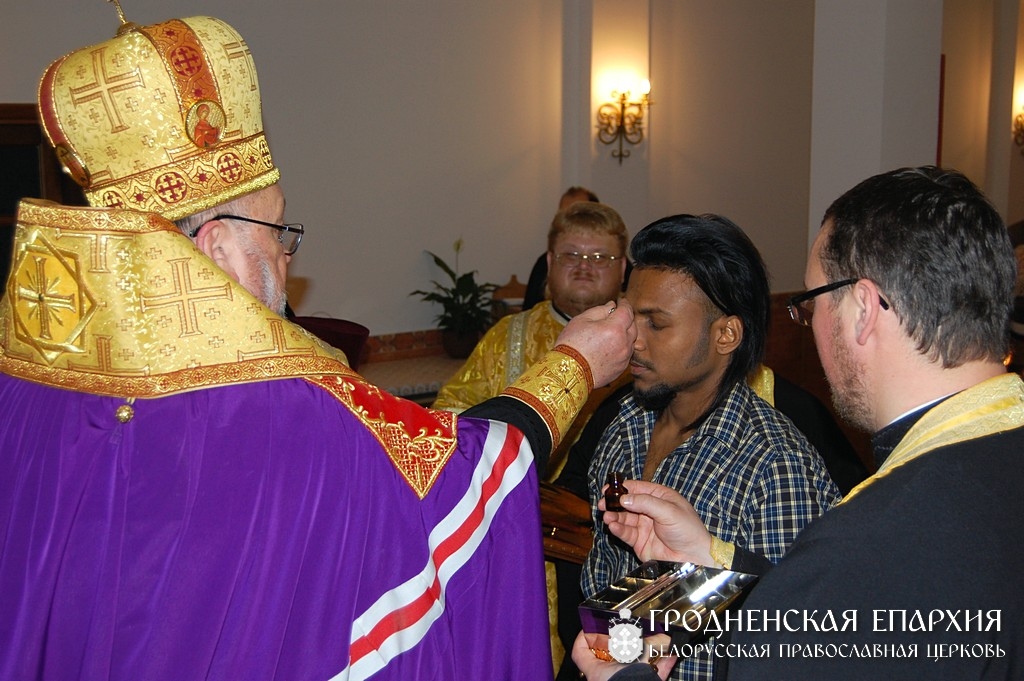 Архиепископ Гродненский и Волковысский Артемий с сослужившими ему секретарем гродненской епархии протоиереем Анатолием Ненартовичем и клириками храма совершили чин присоединения к Православной Церкви над гражданином Шри-Ланки Даниилом. Об этом сообщает сайт Гродненской епархии. «Миропомазание, которое совершалось сегодня над Даниилом, – это личная Пятидесятница. Как две тысячи лет назад Святой Дух снизошел на апостолов, собранных в Сионской горнице, так это происходит и сегодня с каждым из нас. Нас миропомазывали в детстве, мы это вряд ли помним, но Даниил имеет возможность осознанно пережить этот важный момент его жизни. Надеюсь, что, усвоив эти Дары Святого Духа, он последует примеру апостола Фомы, по преданию, проповедавшего христианство на родине Даниила», - сказал после окончания богослужения Владыка Артемий. Приехав в Беларусь изучать медицину, Даниил, который родился в буддийской семье, приобрел здесь намного больше - веру. «В 17 лет у меня была сумасшедшая мечта – попробовать все наркотики, которые мне доступны, а потом отказаться. Через несколько лет первая часть плана была осуществлена, а вот в отношении второй начались проблемы. Это очень стыдно, но теперь я могу об этом говорить: я вымогал деньги у собственной матери, угрожая ей», – делится своей историей Дэнни. Побороть наркотическую зависимость ему помогла тетя-христианка, познакомившая Дэнни с местным пастором. «Я принял крещение и несколько лет провел в реабилитационном центре, хотя и сбегал оттуда пару раз, - говорит он. - Впоследствии, именно желание помогать другим справиться с наркотиками побудило меня приехать в Беларусь, чтобы изучать здесь медицину. Сначала я ходил в католический храм. Но мне там не очень понравилось. Тогда мы с женой решили ходить в Каложу. Мы совсем рядом живем. Здесь мне нравилось и богослужение и община, хотя поначалу смущали иконы, ведь я принял крещение у протестантов. Но потом я увидел, как к ним относятся люди, что в этом нет никакого поклонения. И еще священник Георгий объяснил мне все на примере фотографии любимого человека. Он сказал, что когда мы уезжаем по необходимости из семьи, то берем с собой фото и можем их даже целовать, но любим все равно самих людей. Так же и тут. И тогда я решил стать членом общины». Желание Дэнни, которого в приходе все зовут Даниилом, исполнилось 23 ноября в храме Коложской иконы Богородицы. В планах у Дэнни действительно есть намерение вернуться в Шри-Ланку вместе со своей женой Дарьей. Чем он будет заниматься на Родине, пока не решил, но уже ищет в интернете православные приходы. А пока еще есть время, будет ближе знакомиться с Православием в полюбившейся ему общине Коложского храма. / sobor.by/ по материалам сайта Гродненской епархии. (просмотров 2873)