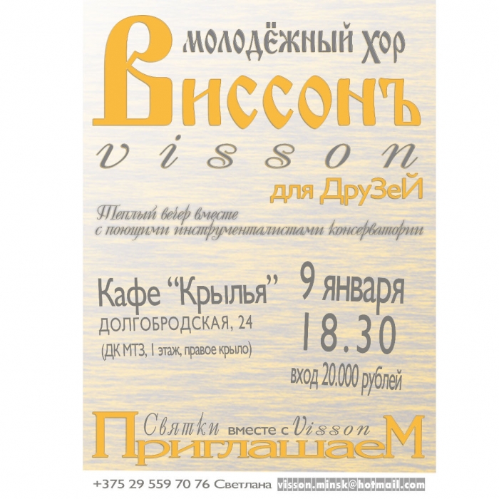 Молодёжный хор «Виссонъ» 9 января в 18:30 приглашает провести тёплый вечер с поющими инструменталистами БГАМ в кафе «Крылья» (улица Долгобродская, 24, ДК «МАЗ», I этаж, правое крыло). Цена входного билета 20 000. По вопросам приобретения обращаться по тел.: +375 29 559 70 76 Светлана.