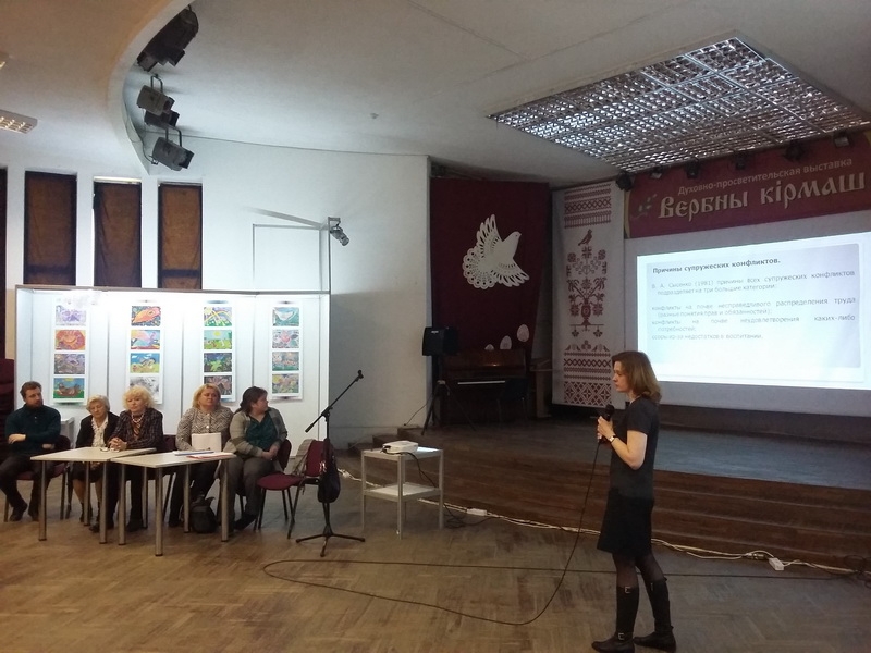 | 22 АПРЕЛЯ 2016 (Пятница) 10:57:18 21 апреля в минском Дворце искусства в рамках духовно-просветительской выставки-ярмарки "Вербны кiрмаш" состоялся День семьи.Культурную программу этого дня открывала встреча за круглым столом "Кризис семьи как проблема современного общества". Для серьёзного обстоятельного разговора в конференц-зале собрались представители различных общественных объединений, в том числе многочисленных профсоюзных организаций самого разного уровня. Ведущая встречи Ирина Конопелько, председатель Фрунзенского районного объединения организаций профсоюзов, отметила широкие возможности, которые предоставляет профсоюзное движение в поощрении и поддержке семей-участников трудового коллектива. От лица лидеров профсоюзного движения столицы заведующая отделом Минского городского объединения организаций профсоюзов Елена Вербило в нескольких словах обрисовала ситуацию с заключением коллективных трудовых договоров на предприятиях в целом по стране и в Минске в частности. Именно тщательно проработанные в трудовом коллективе тонкости этого документа открывают новые возможности для финансовой и социальной поддержки семейных сотрудников предприятия. Для посетителей выставки были перечислены пункты коллективных трудовых договоров с выплатой материальной помощи по предоставлению новых, более широких льгот беременным женщинам; сотрудникам, арендующим жильё; временно нетрудоспособным семейным лицам. Как подчеркнула Елена Вербило, на предприятиях появилась тенденция поощрения работников, воспитывающих детей. Приятной новостью для многих посетителей выставки стали инициативы трудовых коллективов города по предоставлению 1 раза в год свободного от работы дня для прохождения медосмотра детей; премирование одного из родителей, дети которых отличаются хорошей учёбой и поведением; предоставление социального отпуска на 1 день для посещения торжественной линейки, если дети учатся в начальной школе или являются выпускниками и т.д. Непосредственно тему кризисных явлений в современной семье затронула в своём выступлении магистр гуманитарных наук, председатель общественного объединения "Центр поддержки семьи и материнства "Матуля" при приходе храма в честь святителя Николая Японского Вера Сердюк. Зрительный зал православной выставки шокировали предоставленные ею скупые данные мировой медицинской статистики – 11% мужчин на Западе стерилизовали себя по собственному желанию, не собираясь воспитывать детей. Такого агрессивного наступления поборников гендерной идеологии в большинстве западных стран не ожидал никто. Как отметила Вера Сердюк, семейно сберегающая социальная политика нашего государства одна из самых лучших. И всё же поддержка Церкви в таком вопросе не может быть лишней, ведь чем религиознее государство, тем крепче в нём институт семьи. Председатель центра "Матуля" рассказала посетителям выставки о новых модных молодёжных веяниях в отношении брака, которые возникают с завидной регулярностью 1 раз в 5 лет; о работе с проблемными матерями, готовыми на аборт. Её оригинальная трактовка первых дней творения и взаимоотношений Адама и Евы вызвала неподдельный интерес прежде всего у мужской аудитории зала. На примере же различий внутриутробного развития мужского и женского эмбриона Вера Сердюк постар
