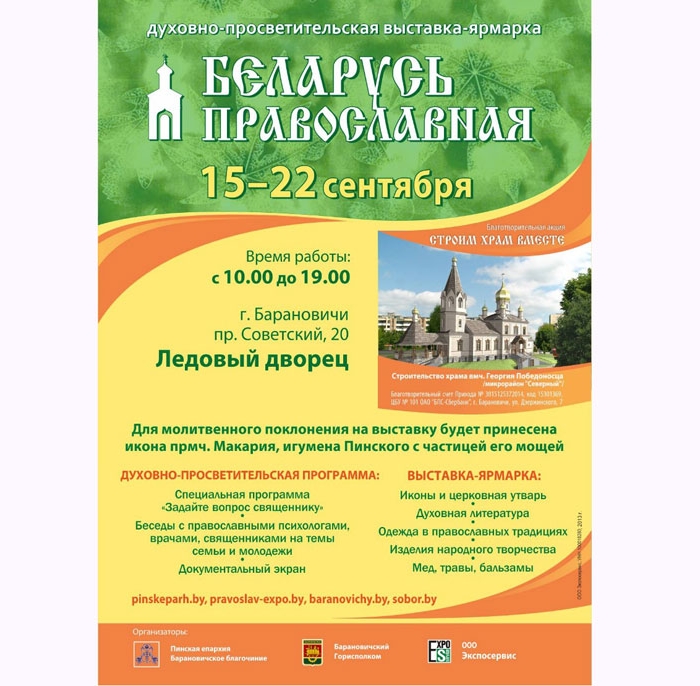 15 сентября в 12.00, после Литургии в храме вмч. Георгия Победоносца, состоится крестный ход к месту проведения выставки, где архиепископ Пинский и Лунинецкий Стефан откроет церемонию открытия выставки молебном на начало доброго дела.