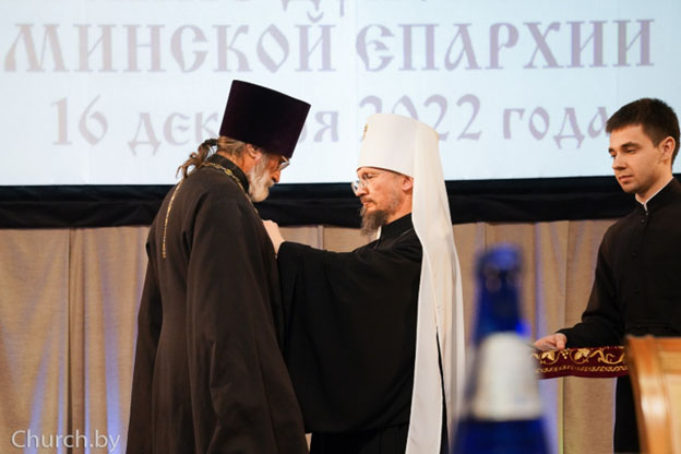 | Его Высокопреосвященство напомнил, что нынешний год для Белорусской Православной Церкви был ознаменован воспоминанием 1030-летия основания Полоцкой епископской кафедры — события, с момента которого принято вести отсчет истории Православия на белорусских землях. В будущем же 2023 году исполняется 230 лет со времени основания Минской православной епархии. "Убежден, что воспоминание этих событий нашей церковной истории, явивших нам многочисленные примеры жизни и ревностного служения Господу и Его Святой Церкви многих поколений священнослужителей, монашествующих и мирян — наших с вами предшественников, призвано послужить для каждого из собравшихся здесь импульсом к дальнейшим усердным трудам на ниве церковного служения", – отметил Митрополит Вениамин. По завершении выступлений все желающие смогли высказаться по существу затронутых тем и иным актуальным вопросам, а также задать вопросы. Завершилось собрание вручением наград ряду священнослужителей епархии. Клирик храма иконы Божией Матери "Всех скорбящих Радость" города Минска протоиерей Евгений Юнес был награждён медалью ордена святителя Кирилла Туровского. 31 декабря 2022 года на 61 году жизни отец Евгений отошел ко Господу. Протоиерей Евгений Юнес более 26 лет прослужил в приходе иконы Божией Матери "Всех скорбящих Радость", снискав любовь и уважение священнослужителей и прихожан. |