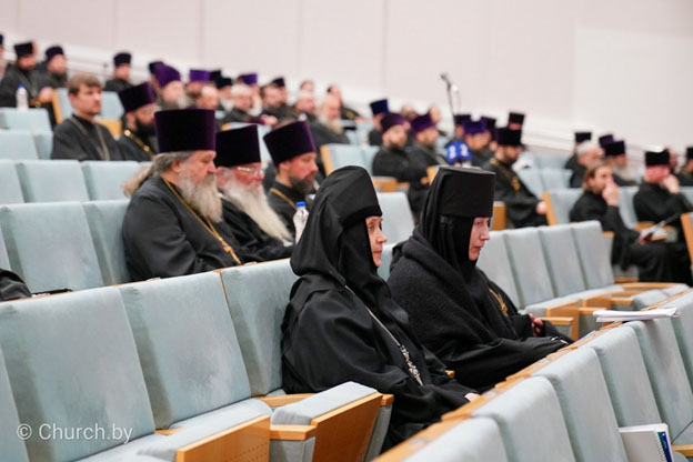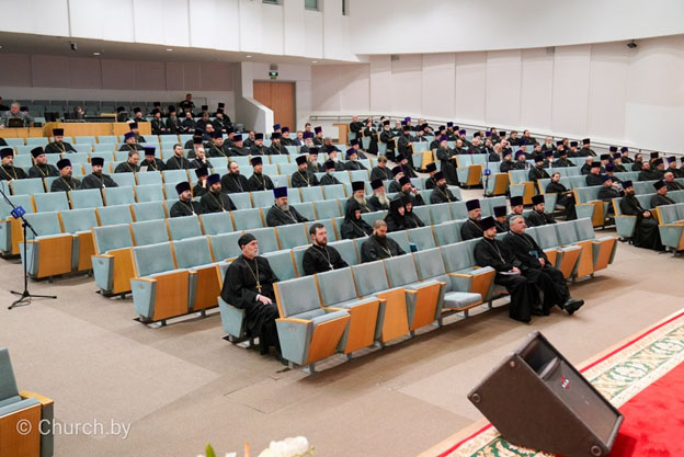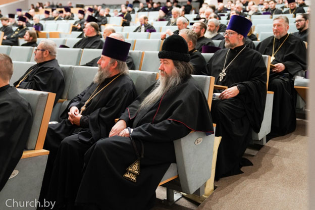 | В собрании приняли участие клирики Минской епархии, игумении ставропигиальных и епархиальных монастырей, ректоры, проректоры и преподаватели духовных учебных заведений, главы и сотрудники епархиальных отделов, руководители братств и сестричеств – всего около 200 человек. В собрании принял участие настоятель единоверческого Московского Никольского храма в Студенцах, клирик Московской епархии игумен Пётр (Васильев), который окормляет в городе Минске старообрядческий приход в честь святого пророка Илии. |
