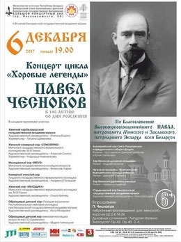 6 декабря в 19:00 в Большом зале Белорусской государственной филармонии по благословению митрополита Минского и Заславского Павла, патриаршего Экзарха всея Беларуси, состоится концерт "Хоровые легенды: Павел Чесноков". Концерт станет первым в рамках проекта, реализуемого Белорусской ассоциацией хоровых дирижёров, и посвящённого творцам хорового искусства от времён его возникновения до наших дней.