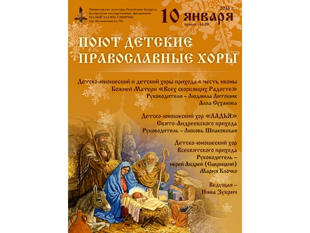 | | 30 ДЕКАБРЯ 2015 (Среда) 12:28:35 10 января в малом зале имени Г.Ширмы Белгосфилармонии состоится хоровой концерт детских православных хоров.