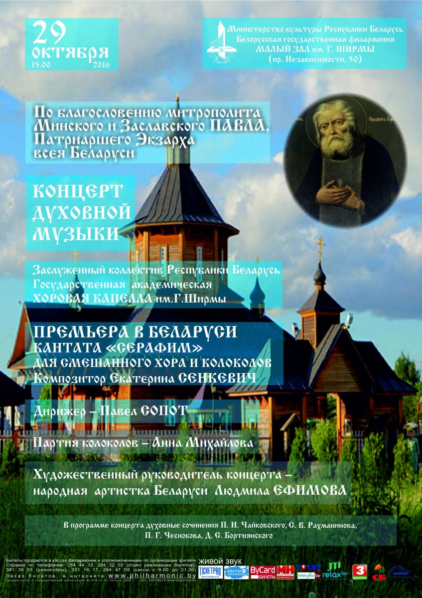 | 25 ОКТЯБРЯ 2016 (Вторник) 14:15:42 29 октября в 15.00 по благословению митрополита Минского и Заславского Павла, Патриаршего Экзарха всея Беларуси, в Малом зале Белорусской государственной филармонии состоится концерт духовной музыки. Как рассказали в интервью Sobor.by организаторы концерта, цель мероприятия – подготовить для жителей города программу, которая позволит слушателям прикоснуться к шедеврам классики духовной музыки, а также услышать сочинения современных авторов. Во время концерта в исполнении Заслуженного коллектива Республики Беларусь Государственной академической хоровой капеллы им. Г.Р.Ширмы (худ.руководитель — народная артистка Беларуси Людмила Ефимова) прозвучат сочинения П. Чайковского, С. Рахманинова, П. Чеснокова, Д. Бортнянского. Также состоится премьерное исполнение в Беларуси кантаты "Серафим" для смешанного хора и колоколов композитора Екатерины Сенкевич. Дирижёр — Павел Сопот, партия колоколов — солист-инструменталист Государственного академического симфонического оркестра РБ Анна Михайлова. Программа концерта: • Е. Сенкевич Кантата для смешанного хора "Серафим" • П. И. Чайковский "Отче наш" • П. И. Чайковский "Достойно есть" • С. В. Рахманинов "Тебе поём" • С. В. Рахманинов "Богородице Дево, радуйся" • П. Г. Чесноков "Да исправится молитва моя" • В. С. Калинников "Камо пойду от Духа Твоего" • А. А. Архангельский "Помышляю день страшный" • Д. С. Бортнянский "Да воскреснет Бог" • Я. Голубков "Отче наш" • А. А. Архангельский "Внуши Боже молитву мою" Справка: Серафим Саровский (в миру Прохор Исидорович Мошнин, 1754-1833) — иеромонах Саровского монастыря, основатель и покровитель Дивеевской женской обители. Прославлен Российской церковью в 1903 году в лике преподобных по инициативе царя Николая II. Один из наиболее почитаемых православных святых./ sobor.by/ По материалам hor.by Надежда Филипчик (просмотров 3322) |