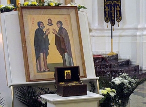 | | 8 ИЮЛЯ 2014 (Вторник) 14:33:44 8 июля, в день памяти святых благоверных князей Петра и Февронии Муромских, по благословению епископа Брестского и Кобринского Иоанна, из Муромского Свято-Троицкого женского монастыря в Брест доставлен ковчег с частицей мощей святых благоверных Петра и Февронии.
