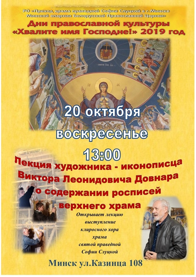 | | 18 ОКТЯБРЯ 2019 (Пятница) 12:42:40 Приход храма праведной Софии, княгини Слуцкой, в городе Минске проводит дни православной культуры "Хвалите имя Господне!" с 18 сентября по 10 ноября. Одним из мероприятий станет лекция художника-иконописца Виктора Леонидовича Довнара, которая будет посвящена содержанию росписей храма святой праведной Софии Слуцкой в Минске. В программе также выступление приходского хора.
